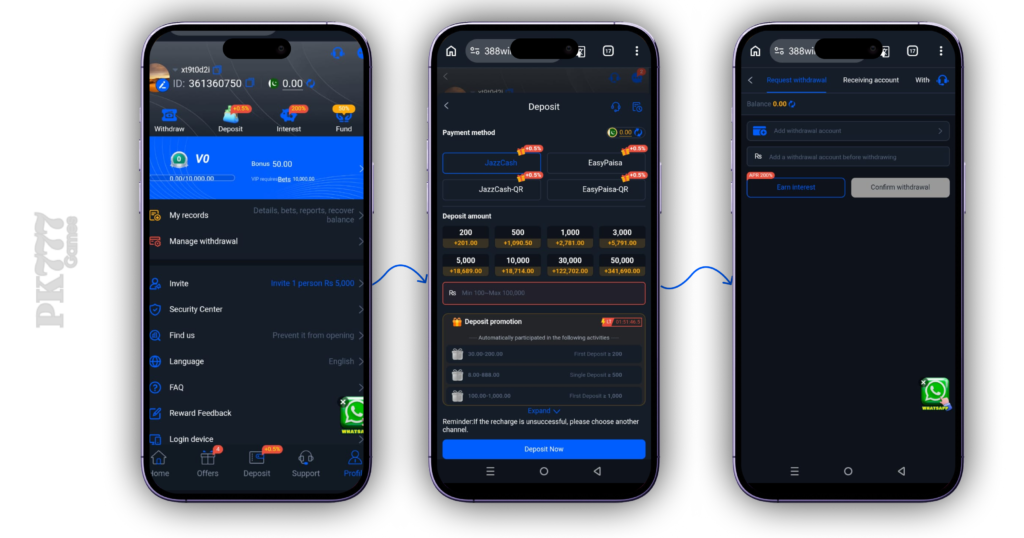 388Win latest version offers multiple deposit methods Pakistan users can trust, including EasyPaisa payment app, JazzCash payment method, and bank transfers. Deposits are credited instantly, and bonus credits often accompany the first few transactions. For withdrawals, users can follow straightforward steps, and most requests are processed within 24 to 48 hours. 388Win minimum withdrawal starts at a reasonable amount, making it accessible even for beginners.