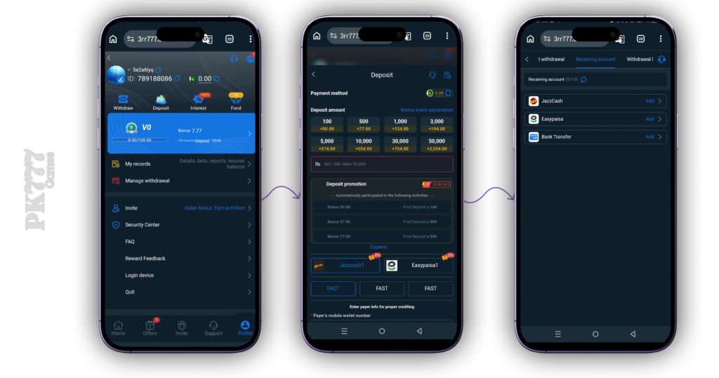 The app supports local payment methods like Easypaisa and JazzCash. Depositing money is fast and secure, and you can start with a low minimum deposit. Withdrawals are also quick, giving instant payouts for all real money rewards.