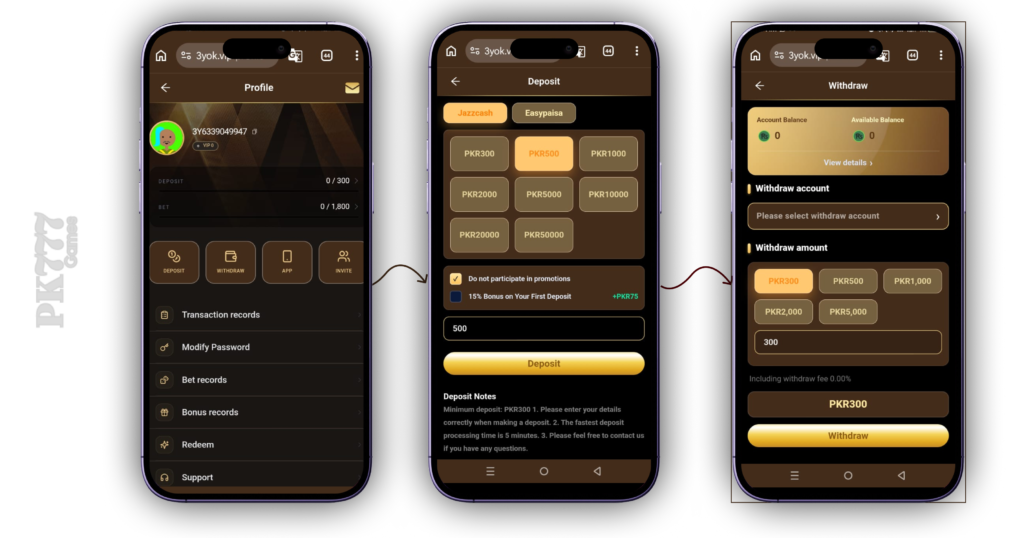 You can deposit and withdraw using Easypaisa, JazzCash, or bank transfer by selecting your preferred method and confirming the transaction in the wallet section.