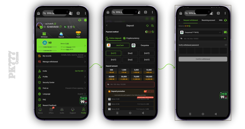 The 999R deposit and withdrawal system allows users to add funds through supported payment methods. Users select the deposit option, choose a payment channel, and enter the amount. Local wallets such as 999R withdrawal methods JazzCash EasyPaisa are often used for convenience in Pakistan.