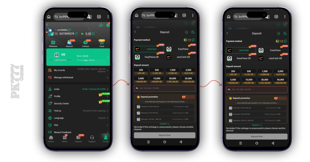 Adding funds in BV999 Game is done through the wallet section. Users select BV999 deposit method Pakistan options such as JazzCash or Easypaisa and transfer money to their account. This makes it convenient for local users who already use these services daily.