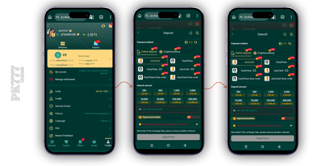Withdraw money instantly through trusted methods like Easypaisa, JazzCash, or bank transfer.