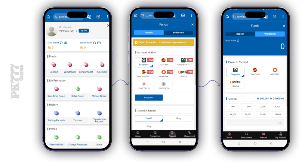 The Cxwin mobile app free version supports several payment methods in Pakistan. Users can deposit money using JazzCash, EasyPaisa, or bank transfers. Withdrawals are fast and secure, ensuring that earned rewards reach players promptly. VIP users can enjoy faster processing times.