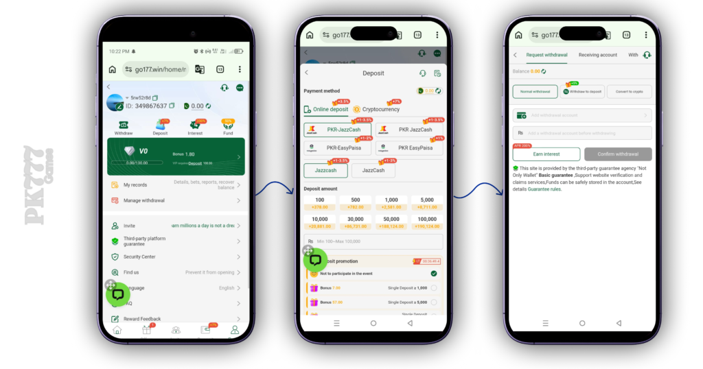 JazzCash, EasyPaisa, and bank transfers are all supported for fast deposits and withdrawals.