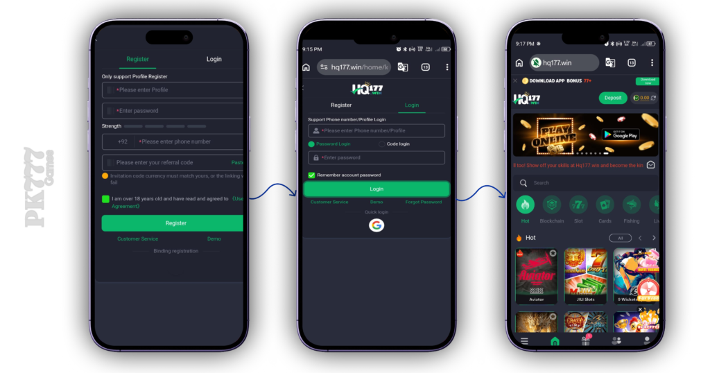 Before playing any game the user must create an account. The HQ777 Game APK Download Latest Version for Android in Pakistan includes a simple registration form. Players open the app and choose the hq777 account signup option on the main screen. The system normally asks for a username, password, and mobile number.