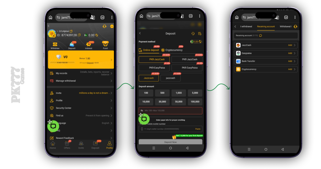 The deposit and withdrawal game system is very convenient. You can use JazzCash or Easypaisa to deposit funds, which makes it accessible for most Pakistani users. The wallet updates in real time, and processing is usually instant.