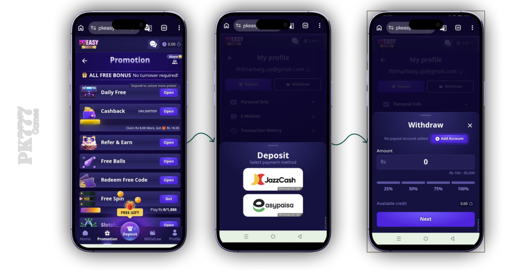 Deposits are mainly done through JazzCash and EasyPaisa. This makes transactions convenient for local users in Pakistan. It is one of the reasons why the platform is popular among real money earning app Pakistan users.