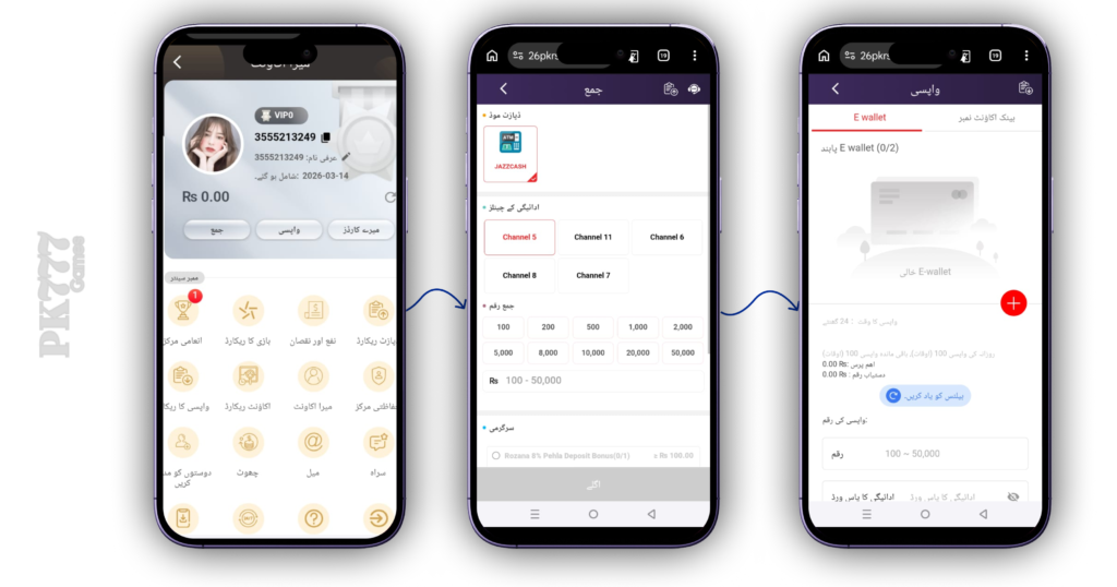 Depositing and withdrawing funds in PKRSPIN Game is straightforward. You can use EasyPaisa, JazzCash gaming, or bank transfers to add funds. Withdrawals are fast, and verified users often receive money within 24 hours.