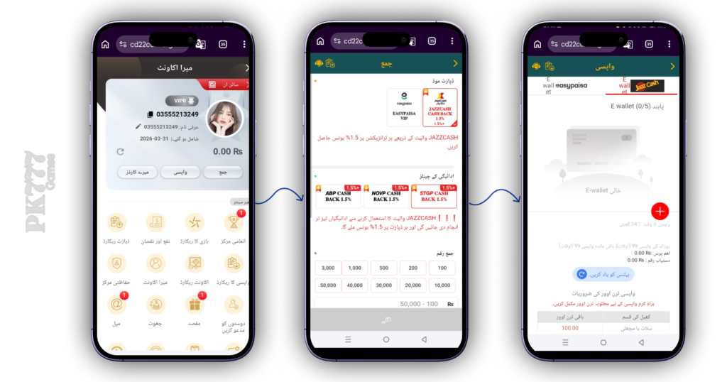 The app commonly supports JazzCash and EasyPaisa for deposits and withdrawals in Pakistan.