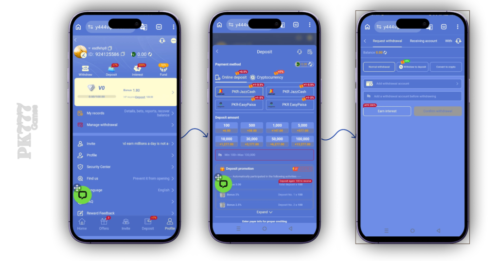 Deposits are fast in this instant payment gaming app. You can use local methods like JazzCash and Easypaisa. This makes it easy for Pakistani users.