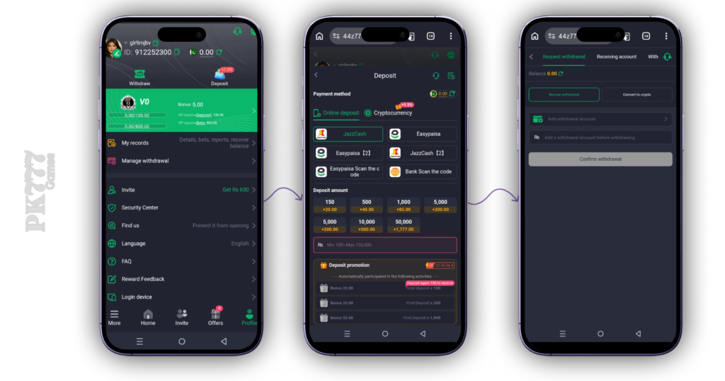Z777 Game supports easy deposits and withdrawals. You can use JazzCash, EasyPaisa, or linked bank accounts. Players can add money, play games, and instantly withdraw their winnings without any long delays.